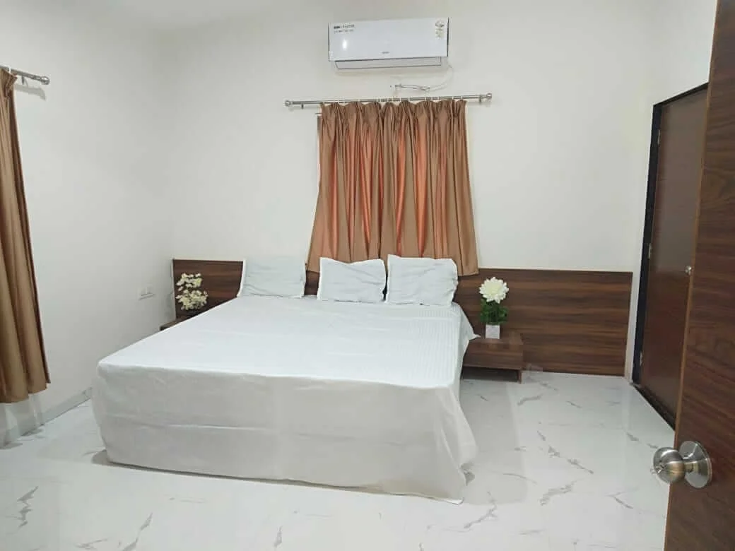 This beautifully designed bedroom offers a peaceful and refreshing ambiance, perfect for unwinding after a long day. The clean white interiors, soft lighting, and neatly styled bed create a sense of calm and comfort. Warm wooden accents and tasteful décor add a touch of elegance, making the space feel both homely and luxurious.